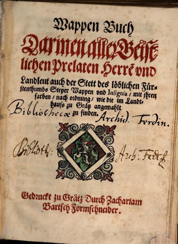 Wappen Buch Darinen aller Geistlichen Prelaten Herren vnd Landleut auch der Stett des Iöblichen Fürstenhumbs Steyer Wappen vnd Insignia