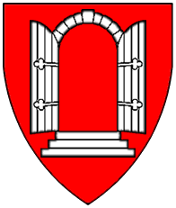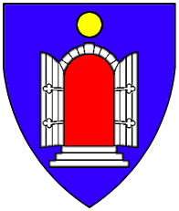 Azure, a double door argent opened gules ensigned with a ball or. | Portegalien? | Portugal | Strip I front page 2. half | Popoff gives the blazon as: D'azur à la porte d'argent ouverte de gueules sommée d'une boule d'or. | |