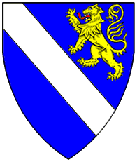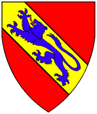 Gules, on a bend or a lion passant azure. | - | Pont-en-Ogoz | Strip III back page 5 | Rietstap blazons the arms of Pont-En-Ogo as: De gueules, à la bande d'or, chargée d'un lion passant d'azur. | |