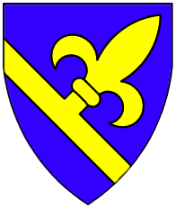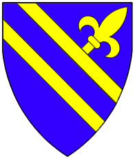 Azure, two bendlets or and in chief a demi-fleur-de-lys issuant from the upper bendlet. | - | Lommis | Strip III back page 6 | Rietstap blazons the arms of Lommis as: D'azur, à deux cotices d'or, accompagné d'une fleur-de-lis au pied coupé du même, posée en barre, mouvant de la première cotice. | |