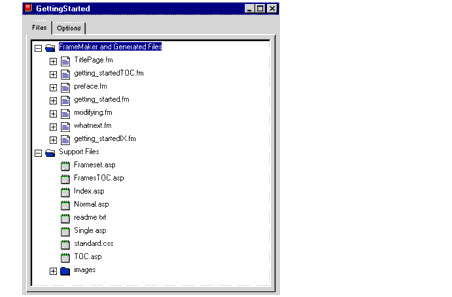 The file tree view shows how your project is organized. Double-click a file name or icon to view FrameMaker source files or text and graphic output files.
