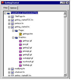 Each FrameMaker file that you add to your project has an entry in the project window. To see the output files for a particular FrameMaker file, click the plus sign next to the FrameMaker file. The output files are divided into pages and graphics. Click the plus signs next to the Pages and Graphics folders to display the output files.
