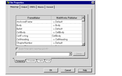 -  To change a mapping, click the FrameMaker style that you want to change. Then, select the WebWorks Publisher Standard Edition style you want from the drop-down list at the bottom of the dialog box. See step 11 for recommendations about mapping paragraph tags.