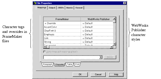 In general, map your styles to Default, which will preserve the bolding, italics, and so on, created by the character styles used in your FrameMaker files. If you've created a character style in FrameMaker for highlighting URLs, map that style to WebJump. Overrides in your files are represented by +Override; map the +Override format to Default.