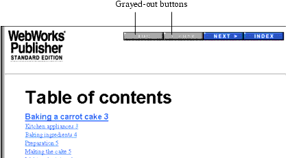 By default, the Top and Previous buttons are grayed out (not linked) in the TOC output because you are already at the top of the list of files and no previous file is available.