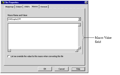 The Macros tab is unlike the other tabs on the File Properties window because it does not contain mappings of FrameMaker formats to WebWorks Publisher formats. Instead, you type in new values in the Macro Value field to override the default values provided by Publisher. The following sections describe the changes you can make on the Macro tab: