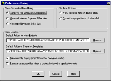 The User Options section of the Preferences dialog box lets you specify default folders for new projects and templates and choose whether the Project Launcher dialog box is displayed on startup and whether temporary files created by the project are retained or deleted.