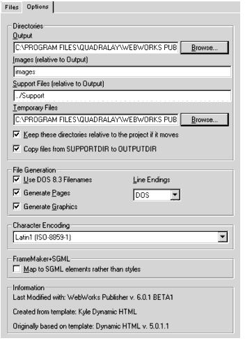 The Options tab of the Publisher Project window displays general information about the project and lets you set the following: