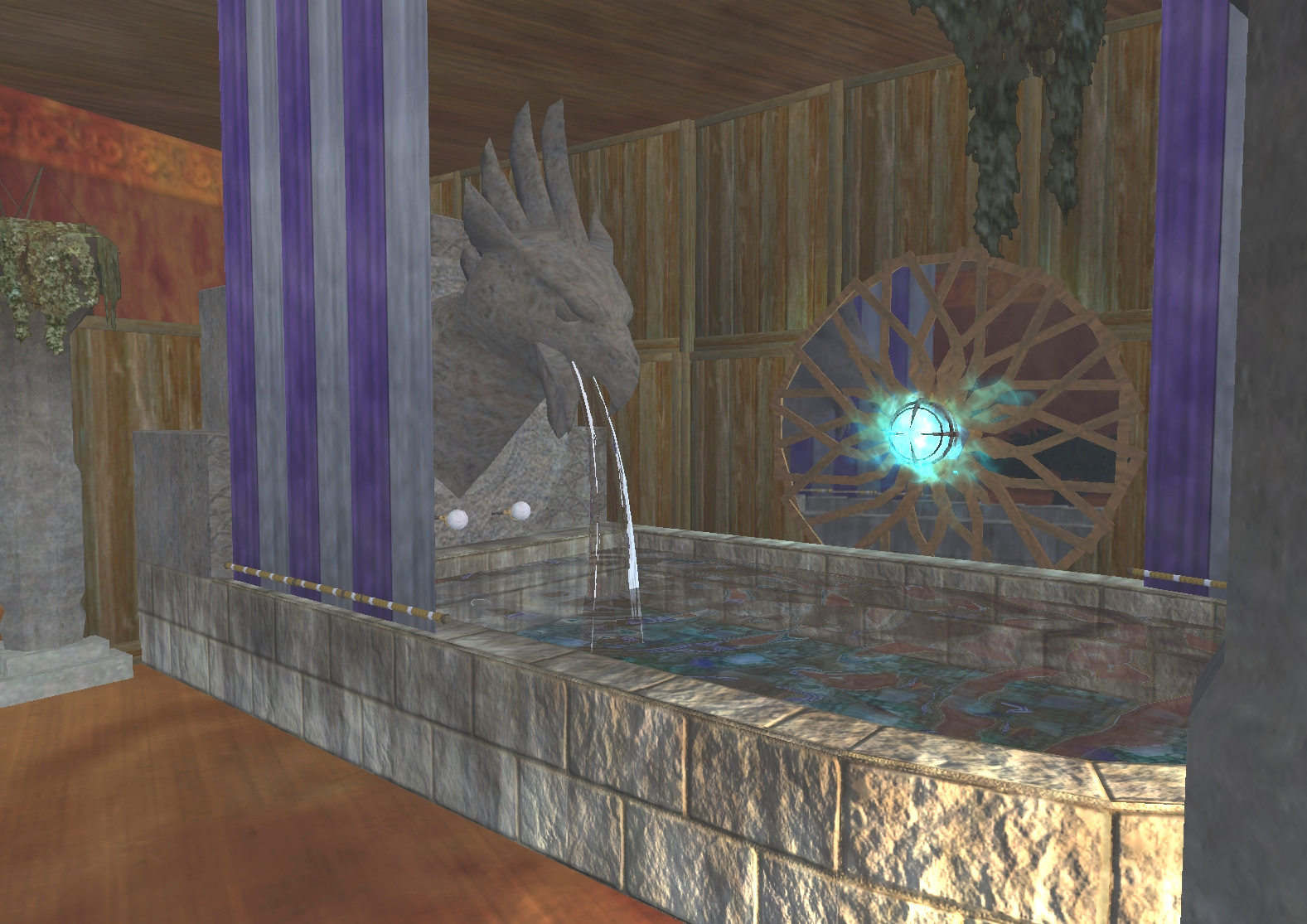 The tub is provided with controls for hot and cold piped water, and curtains for privacy. In the back is a mirror portal, invented by Sevarious Splinterclaw.