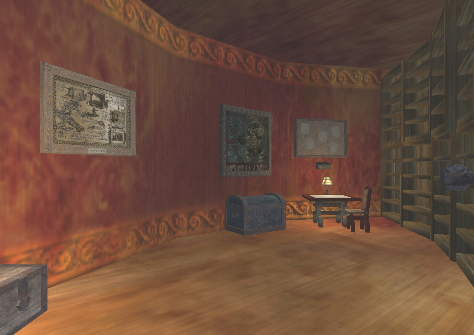 The other side of the crafting area contains a strongbox and a small desk where accounts are kept.