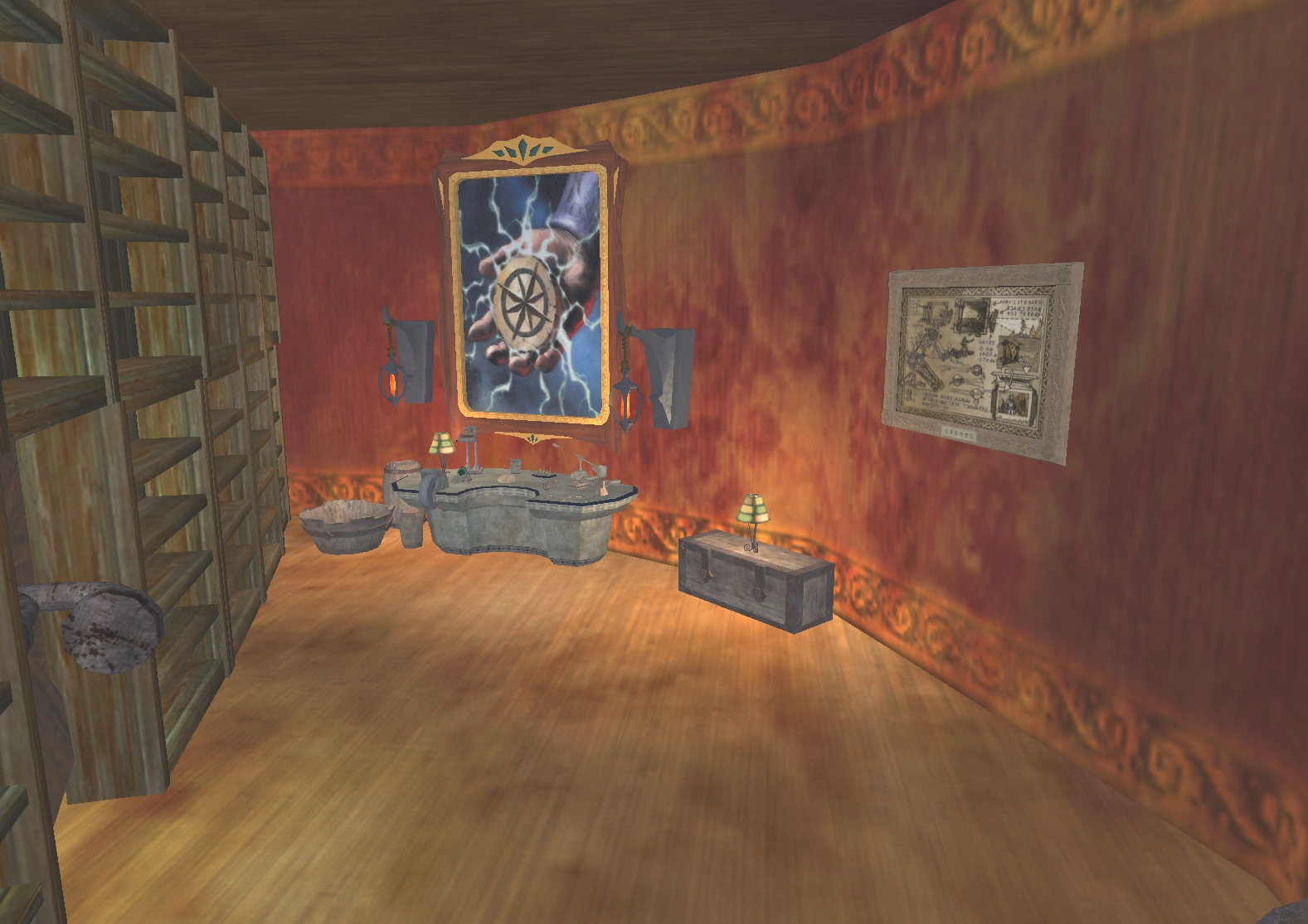 Passing through the mirror portal, one enters Freydísa's crafting area. As a jeweler and rune-smith, this area provides security for valuable raw materials and a quiet place to work. The painting The Rune complements her work.