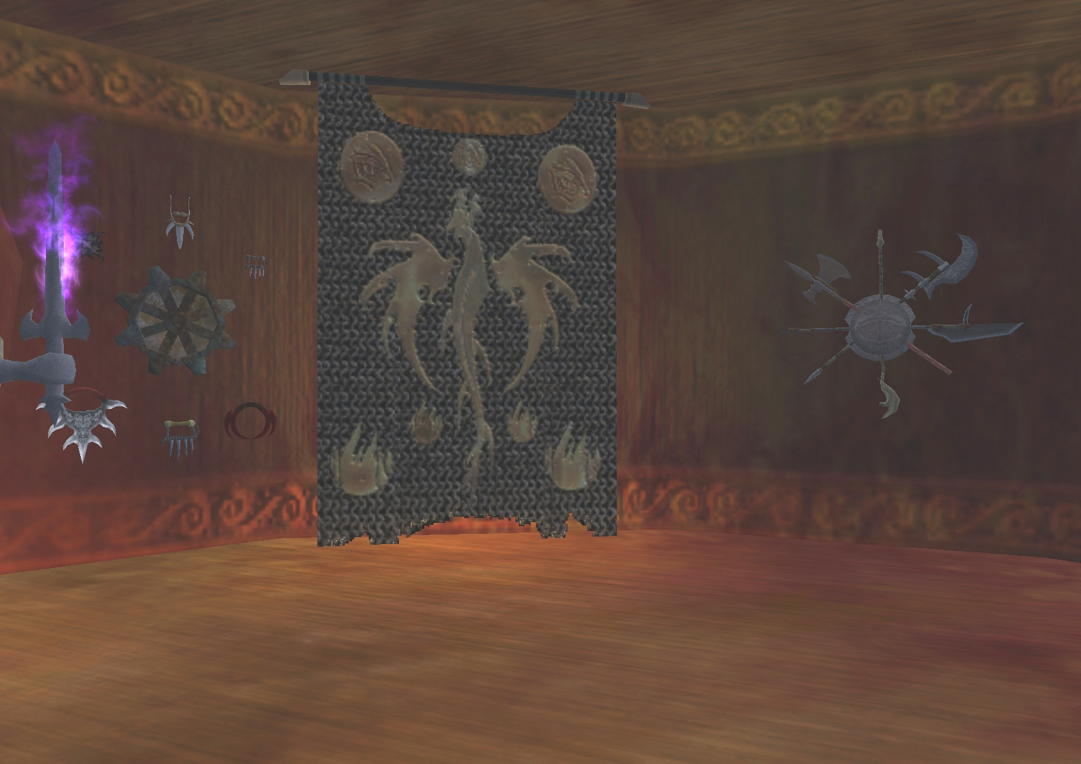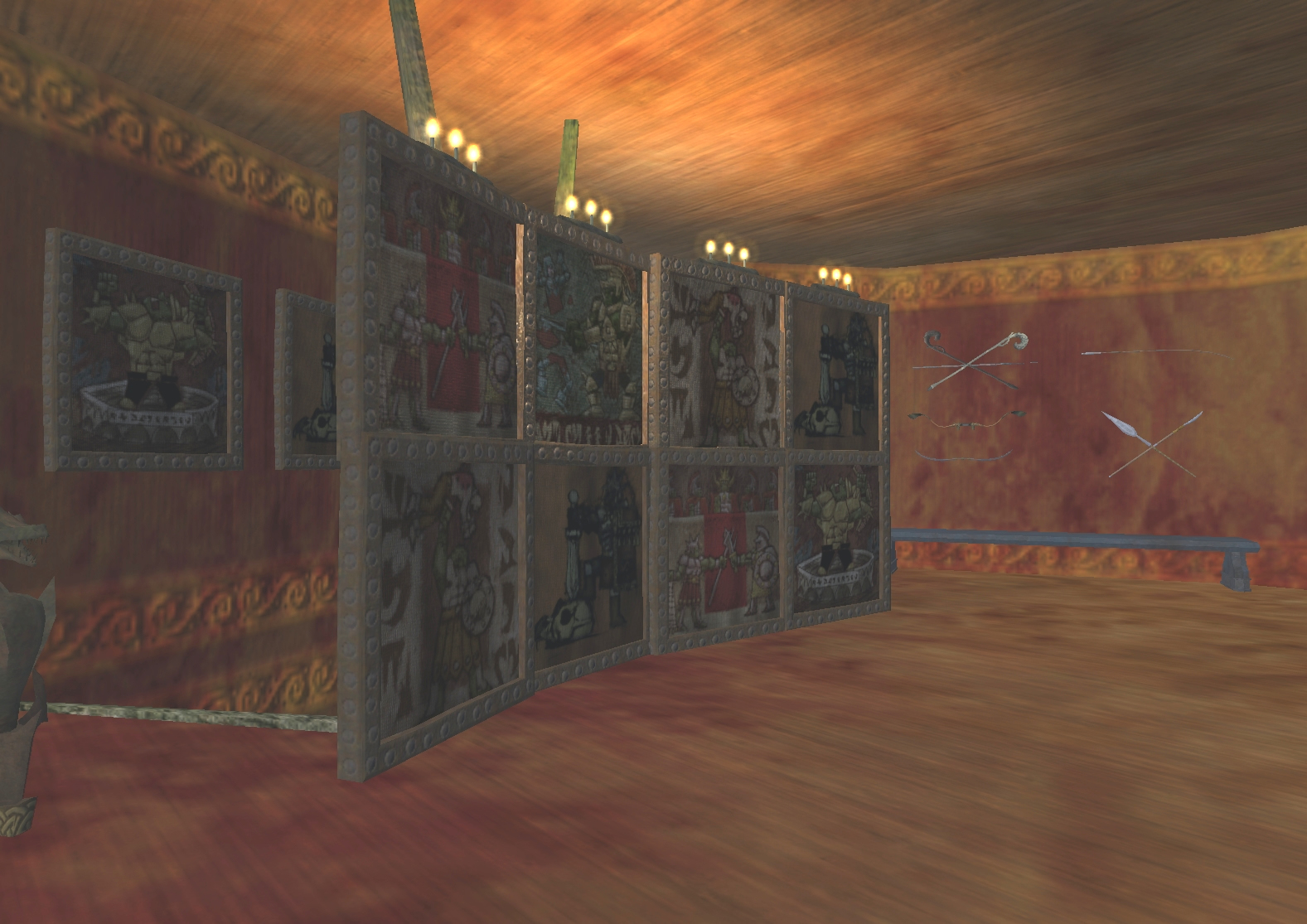Backlit tapestries and the trophies of many conquests decorate the room.